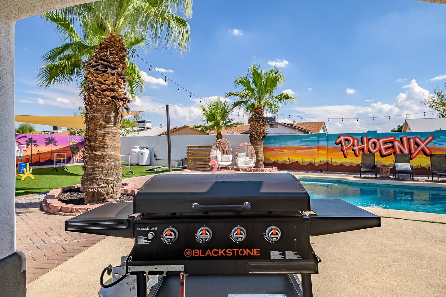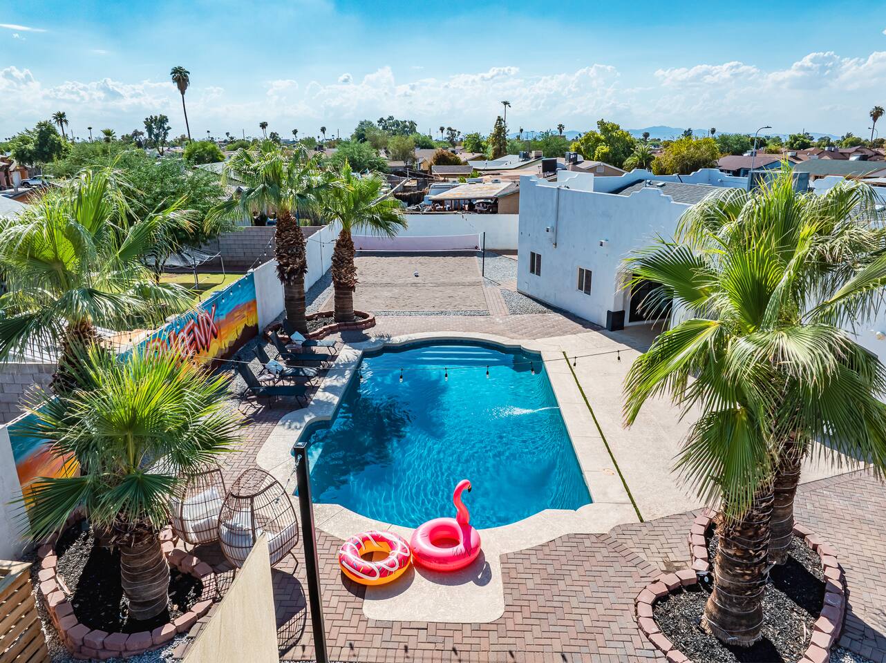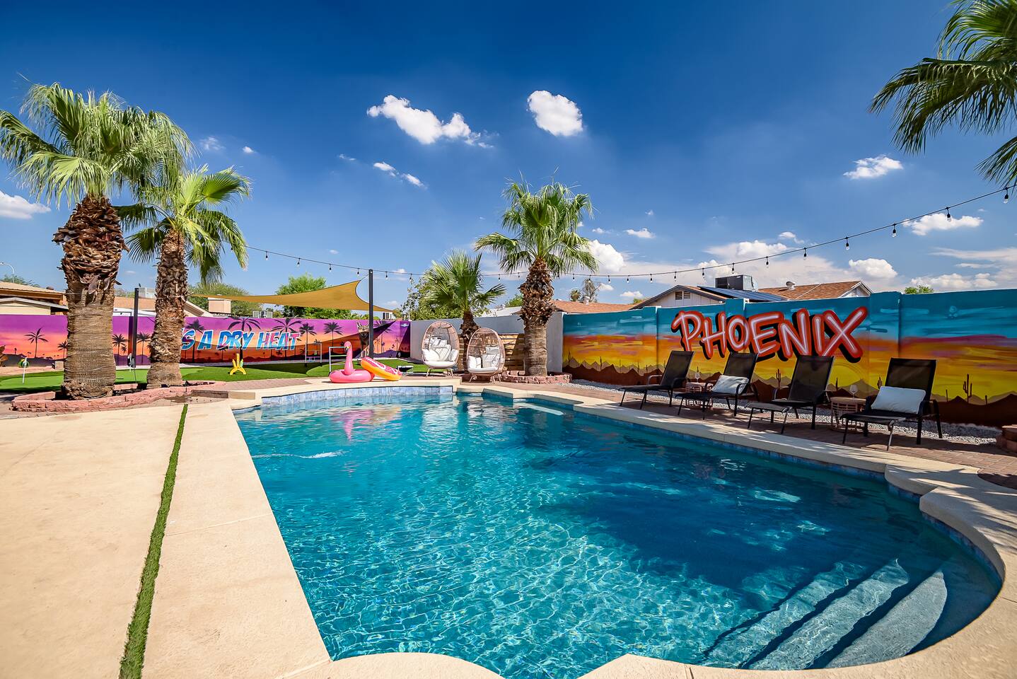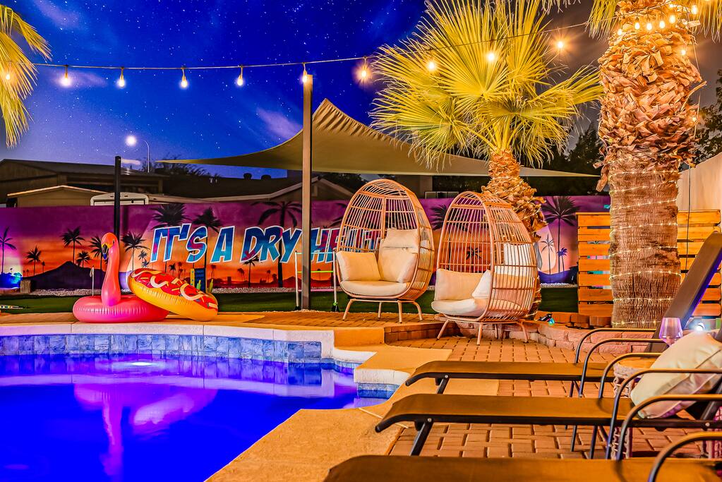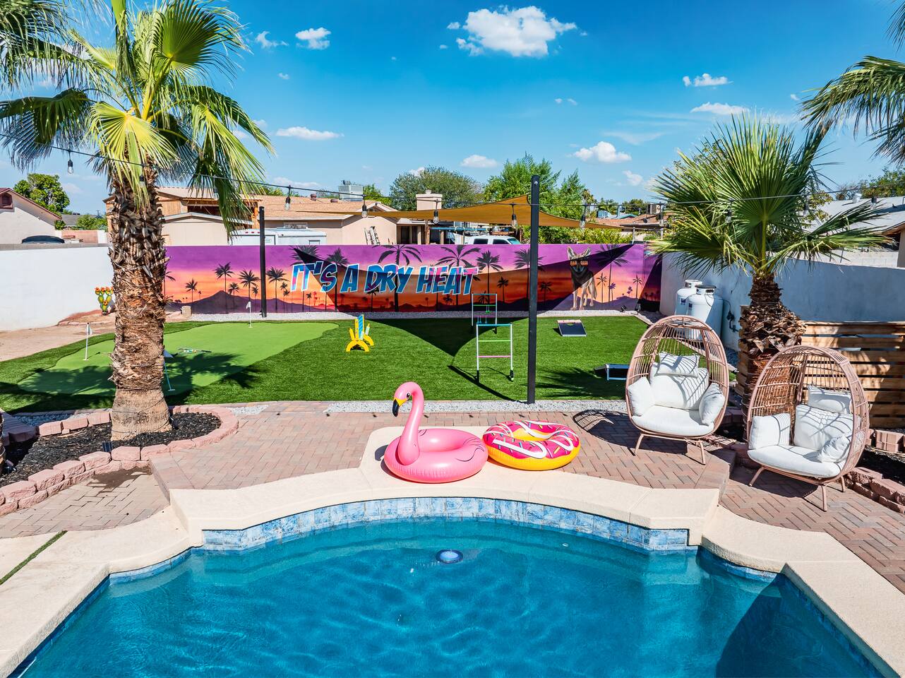 KEY INDOOR FEATURES: ☀️ 3 beautiful bedrooms: 1 king 65" smart TV, 1 queen 50" smart TV, & 2 full beds 50" smart TV 🌵Living room features a queen sleeper sectional ☀️ Additional single pullout bed in closet for an extra guest 🌵2 full bathrooms ☀️ Modern kitchen with stainless steel appliances 🌵 Open living room with lots of comfy seating & 75" smart TV ☀️ Dining room with seating to comfortably accommodate 8 (+ 3 countertop seats) 🌵 3 full size Arcades with a wide selection of games ☀️ High Speed Wifi KEY OUTDOOR FEATURES: ☀️ Large heated Diving pool with LED lighting - ** Pool Heat is available for an extra fee** 🌵 Blackstone Flat top grill ☀️ 4 comfy lounge chairs for tanning 🌵 Fire table with Seating ☀️Outdoor shower 🌵 Volleyball / Badminton court ☀️3 hole putting green 🌵 basketball net ☀️ Shaded Turf area for lawn games including corn hole, connect 4 and SO much more ! 🌵 Giant wall murals inside and out — makes for an awesome back drop for photos with friends and family ! ☀️ 6 person Hot Tub 🌵55" TV on a rolling Stand to Catch the game from the fireable, poolside, the Hot Tub or wherever suits your style! 12mi to Phoenix Sky Airport ⚾️🧢 World Series Champions LA Dodgers & Chicago white Sox’s 🧦 Spring Training 7 miles away ⚾️ Milwaukee Brewers Spring Training 2.4 Miles Away Nearby golf - Grand Canyon university championship golf course 2.3 miles - Desert mirage 5.9 miles - Cold water golf club 9.3 miles - Palm valley golf club 11.6 miles - Falcon dunes golf course 15.3 miles - Top Golf 6.7 miles Event Centres: 2.4mi to Talking Stick Resort Amphitheatre 6.5mi to Westgate (cardinals stadium) 11mi to Chase field (diamondbacks MLB) 11mi to footprint centre (Phoenix suns) Banner Estrella Hospital 3.5 Miles Guest access All of it! Entire home, Many extras. Property is professionally cleaned and sanitized between every guest !