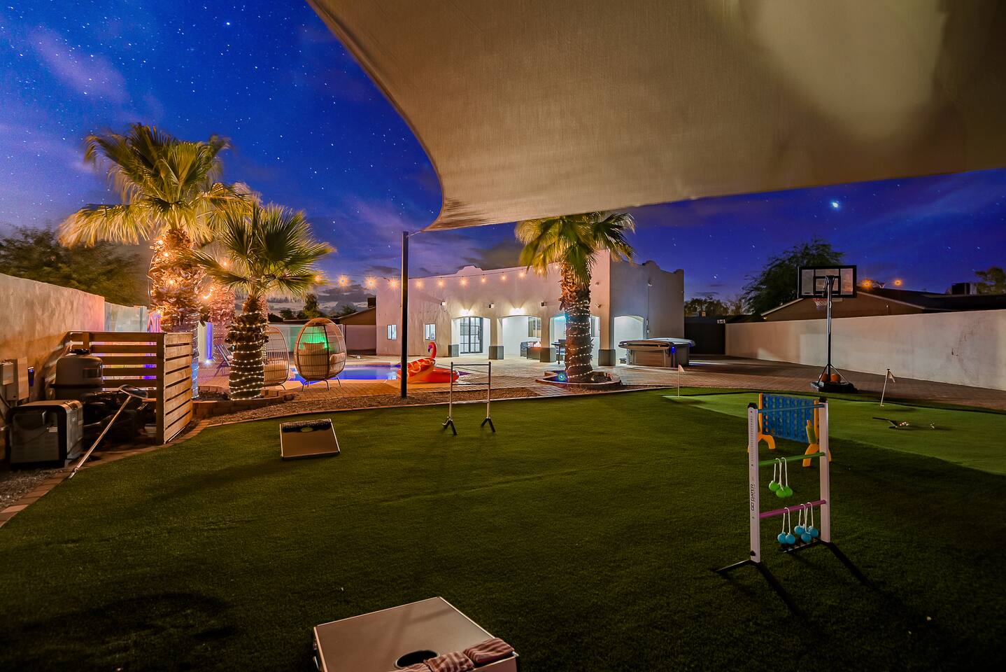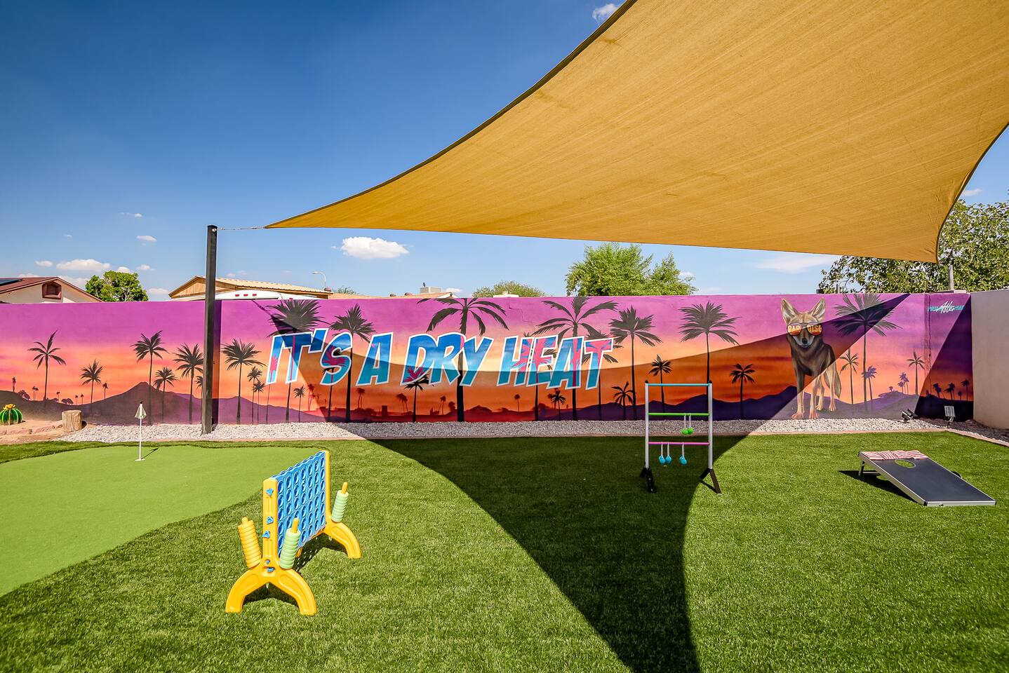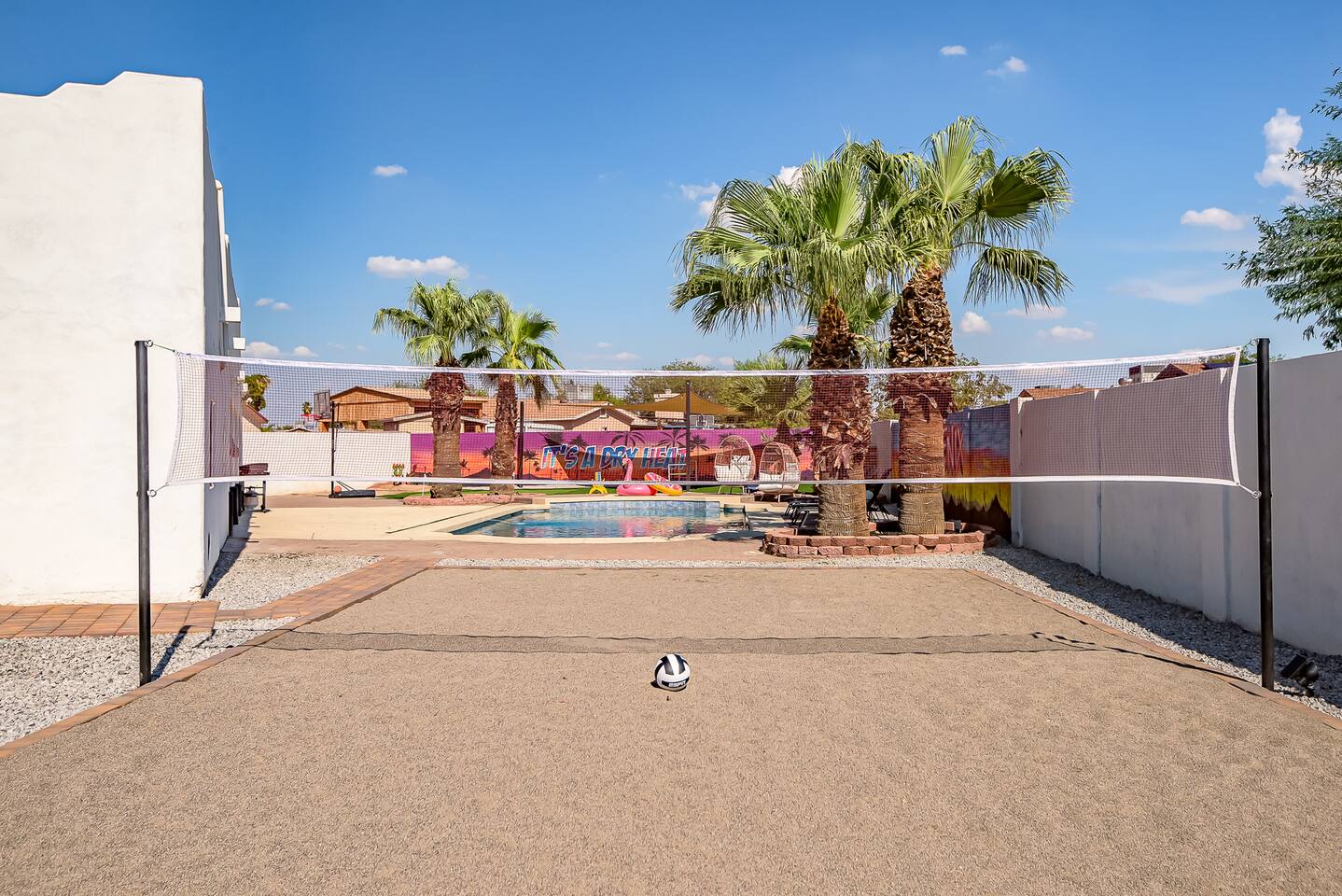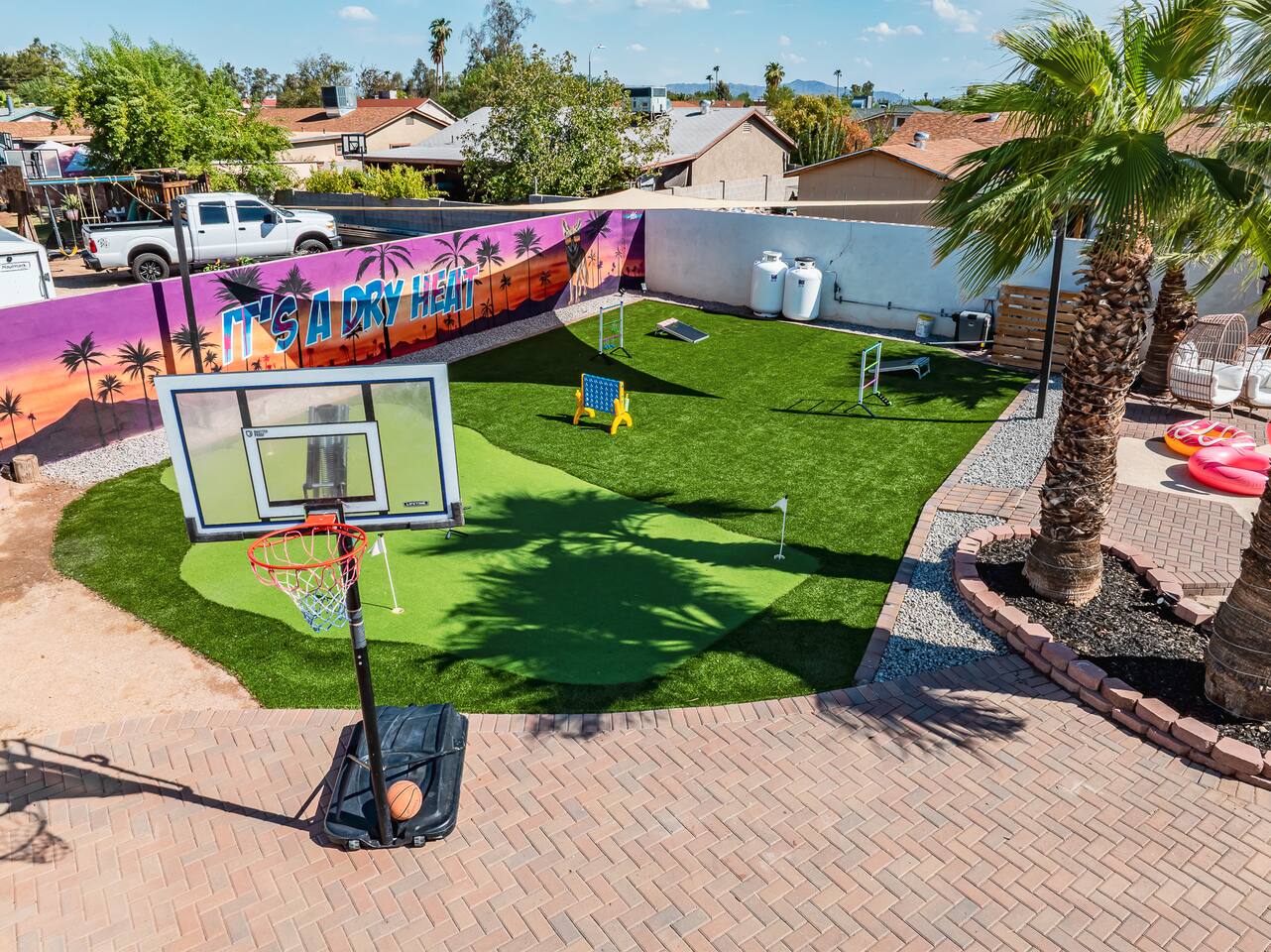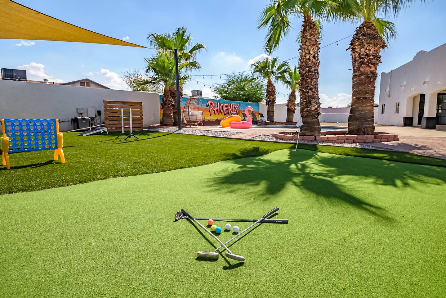 KEY INDOOR FEATURES: ☀️ 3 beautiful bedrooms: 1 king 65" smart TV, 1 queen 50" smart TV, & 2 full beds 50" smart TV 🌵Living room features a queen sleeper sectional ☀️ Additional single pullout bed in closet for an extra guest 🌵2 full bathrooms ☀️ Modern kitchen with stainless steel appliances 🌵 Open living room with lots of comfy seating & 75" smart TV ☀️ Dining room with seating to comfortably accommodate 8 (+ 3 countertop seats) 🌵 3 full size Arcades with a wide selection of games ☀️ High Speed Wifi KEY OUTDOOR FEATURES: ☀️ Large heated Diving pool with LED lighting - ** Pool Heat is available for an extra fee** 🌵 Blackstone Flat top grill ☀️ 4 comfy lounge chairs for tanning 🌵 Fire table with Seating ☀️Outdoor shower 🌵 Volleyball / Badminton court ☀️3 hole putting green 🌵 basketball net ☀️ Shaded Turf area for lawn games including corn hole, connect 4 and SO much more ! 🌵 Giant wall murals inside and out — makes for an awesome back drop for photos with friends and family ! ☀️ 6 person Hot Tub 🌵55" TV on a rolling Stand to Catch the game from the fireable, poolside, the Hot Tub or wherever suits your style! 12mi to Phoenix Sky Airport ⚾️🧢 World Series Champions LA Dodgers & Chicago white Sox’s 🧦 Spring Training 7 miles away ⚾️ Milwaukee Brewers Spring Training 2.4 Miles Away Nearby golf - Grand Canyon university championship golf course 2.3 miles - Desert mirage 5.9 miles - Cold water golf club 9.3 miles - Palm valley golf club 11.6 miles - Falcon dunes golf course 15.3 miles - Top Golf 6.7 miles Event Centres: 2.4mi to Talking Stick Resort Amphitheatre 6.5mi to Westgate (cardinals stadium) 11mi to Chase field (diamondbacks MLB) 11mi to footprint centre (Phoenix suns) Banner Estrella Hospital 3.5 Miles Guest access All of it! Entire home, Many extras. Property is professionally cleaned and sanitized between every guest !